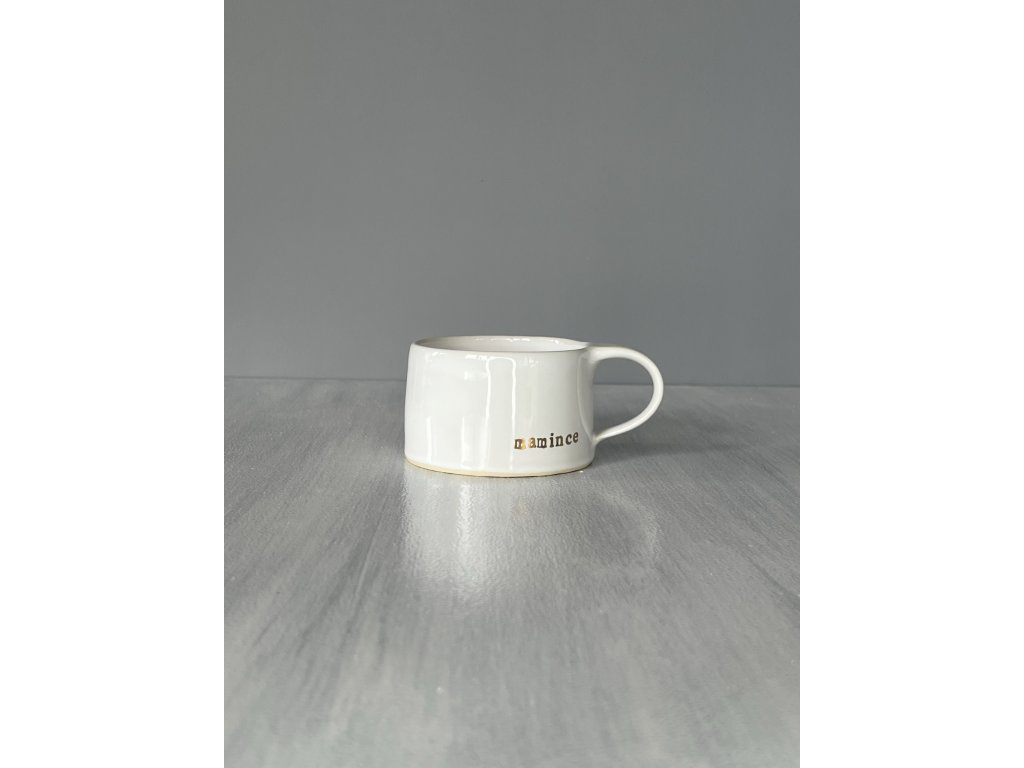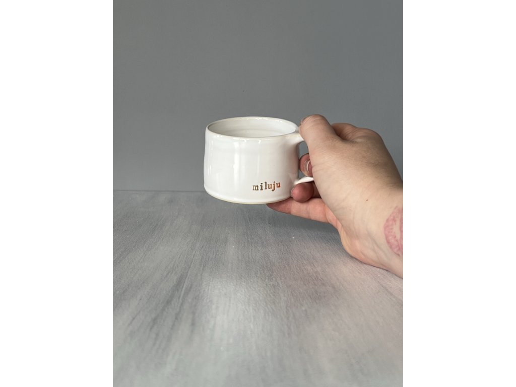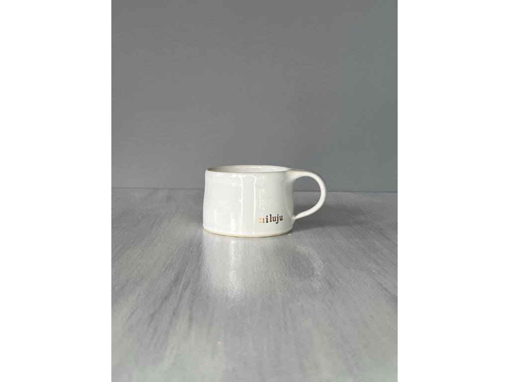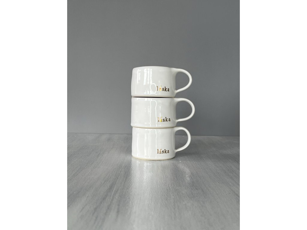 Na kruhu točený keramický hrnek. Glazovaný, s nápisem z 24kt zlata. Středně velký, kávičkový - kapůčo.