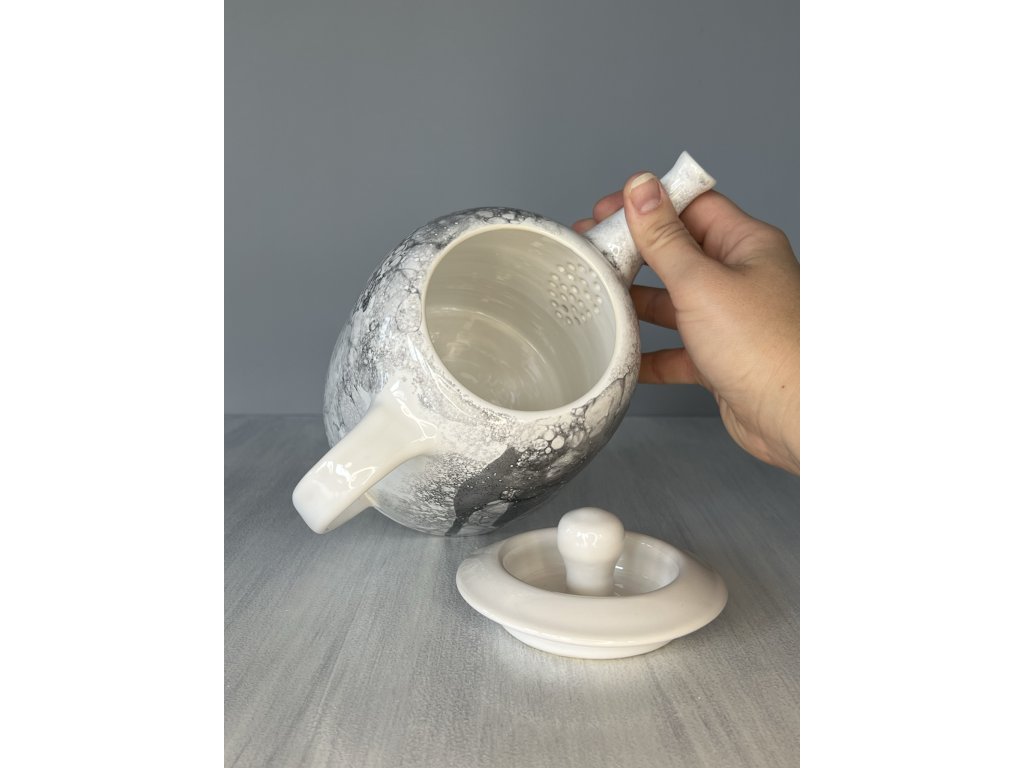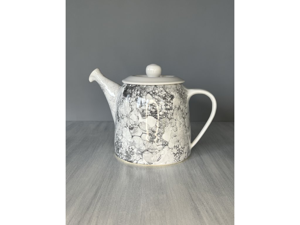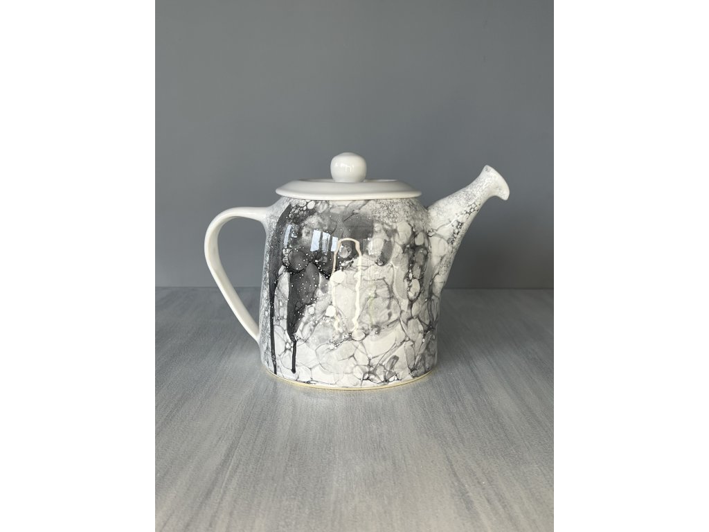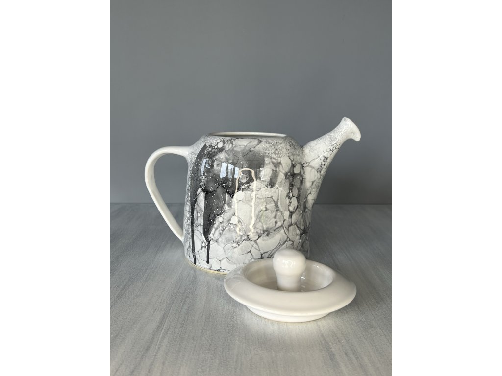 Velká, na kruhu točená keramická konvice, v bílé glazuře s černou, připomínající mramor.